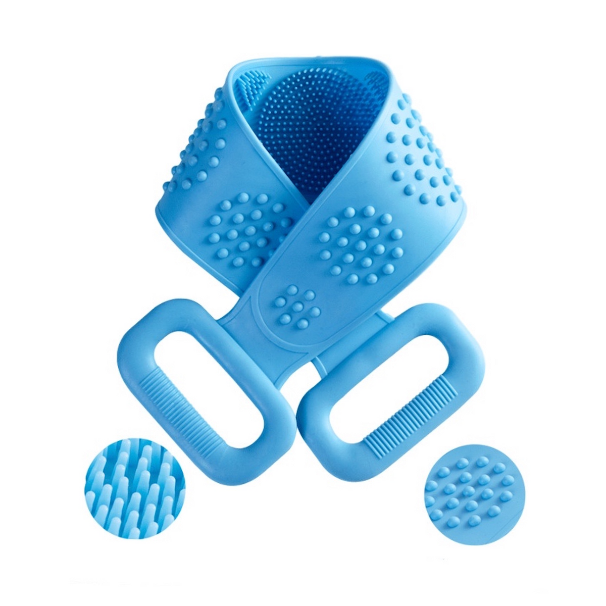 It is made of silica gel. The rear washer for shower is composed of two parts with different thickness. On one side is a dense soft brush that can effectively exfoliate and massage the skin. On the other side are hard particles that can massage the back. You can scrub different parts of your body in the bathtub as needed. Machine washable and durable. It is suitable for anyone. It is suitable for bathroom. There is room to imprint your logo. 28.34"*4.33"