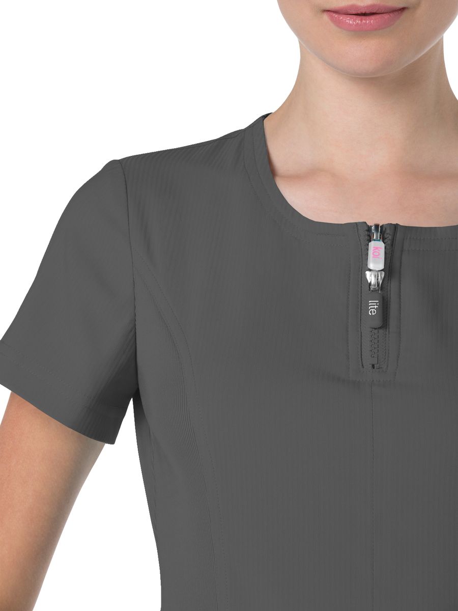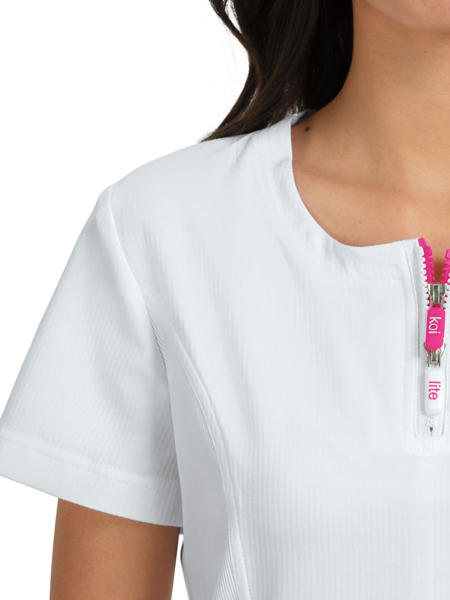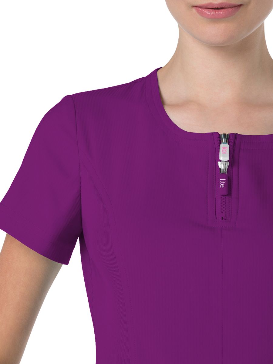 Stay cool, comfortable, and stylish during long shifts with this lightweight, slim-fitting athletic scrub top. The contemporary fit and performance stretch fabric offer a flattering silhouette and unrestricted movement, while the breathable, moisture-wicking material keeps you dry and comfortable all day long. The unique double-zipper at the neck provides customizable ventilation and a touch of sporty style. With four front pockets, you'll have plenty of space for your essentials. Rib knit trim on the sides and side slits add comfort and a touch of flair, while the 27" length (size Small) ensures a flattering fit. Easy wash-and-wear fabric makes this top a practical and stylish choice for any healthcare professional.